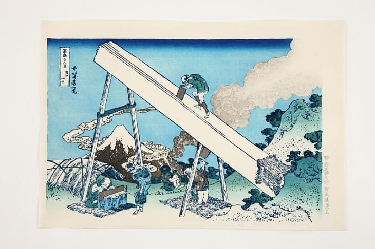 左から右へ大胆な対角線に大きな材木を描き、木挽き職人が上から、もう一人は下から巨大な材木を挽く姿が印象的です。巨材を支える三又の足場、その間に見える富士山の姿も三角と、三角形を駆使して作り上げたこの絵は、一種の機構美を見る人に感じさせてくれます。その間をぬうような焚火の煙りと富士山を巻く巻雲によって構成され、この絵をさらに優れたものにしています。