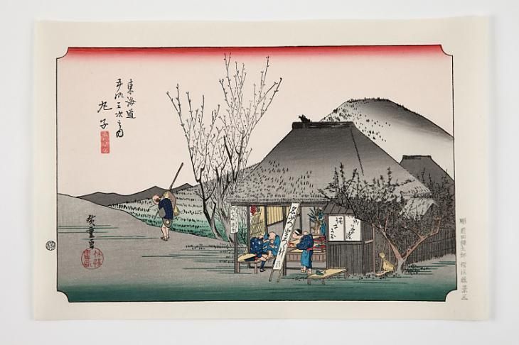 府中から8キロ。広重はとろろ汁で有名なこの店を「名物茶屋」と題して描いています。