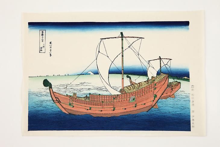 水平線を湾曲に描いて大海の広さを示したり、いかにも波静かな上総の海上から水平線と遠い浦廻をはるかに描き、その中央に富士山の姿が、ここより他のどこにも動かせない位置に描かれています。あらためて富士山の存在感を感じさせてくれる、北斎の絶妙なセンスが随所にあらわれた作品です。