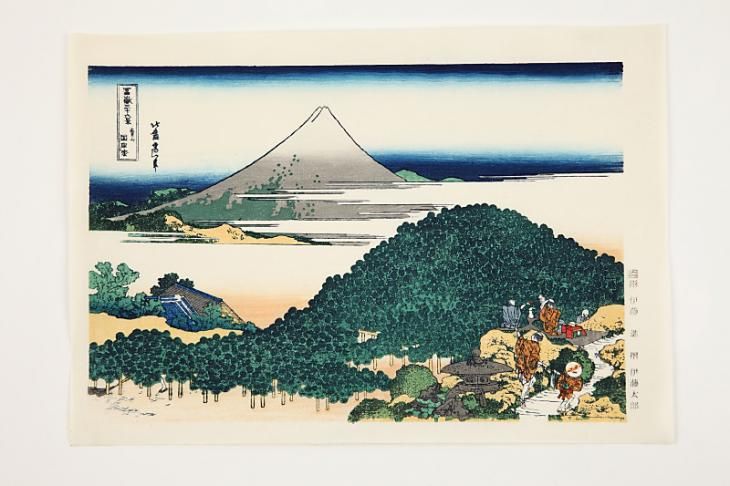 題名のとおり、全図に富士山のある風景を描いたシリーズ物で、葛飾北斎の代表作にとどまらず、浮世絵風景画の代表作ともいわれています。はじめ、三十六図が刊行されましたが、好評のため十図が追加され、計四十六図が刊行されました。当初の三十六図を「表富士」、追加の十図を「裏富士」と呼びます。富士山への篤い信仰は今と変わらず人々の間にあり、当時、集団で富士山に参拝する「富士講」が盛んに行われるなど、こうした社会背景のなかで北斎は『富嶽三十六景』を描き、爆発的ヒットとなりました。