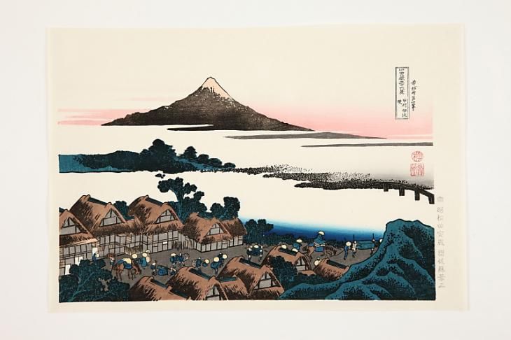 晴れの一日になるだろう、幻想的なあかね色の空に富士山がくっきりと雄大な姿を見せています。朝の光が川沿いの宿場(伊沢は現在の甲州街道の石和)の屋根を照らしている様子も、北斎の巧みな色調によってよく表現されています。凛とした朝の空気のなか、慌ただしく宿場から出発する旅人たちの喧噪や足音が聞こえてくるようです。