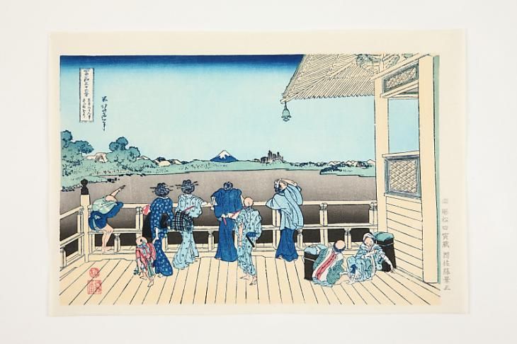 「さざい堂」はその寺内にあった三層の堂宇で、ここから富士山を眺望することができ、多くの人で賑わったそうです。描かれているのは、町家の男や子供連れの女房、丁稚、そして札所廻りなどが、堅川越しにくっきりと浮かぶ富士山を楽しんでいるところです。なお、五百羅漢寺は現在、目黒に移転しています。
