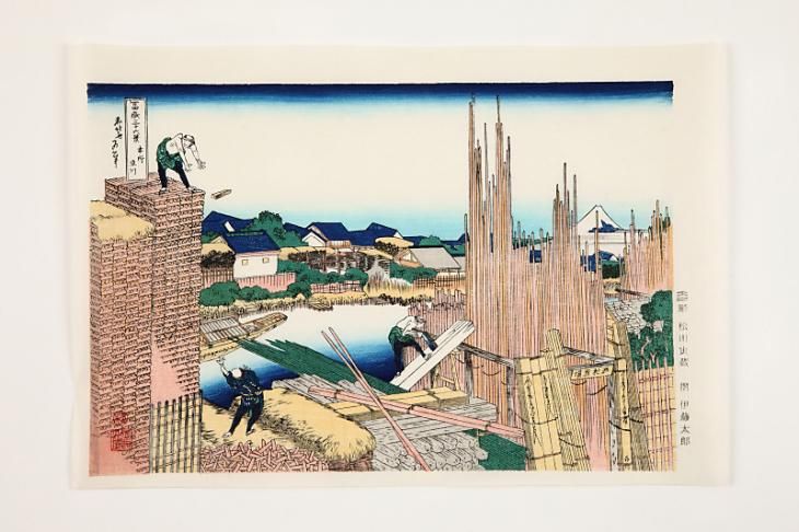 このあたりを描いたもので佳作のひとつとして数えられています。縦の直線と横の直線を左右からつめて、その間に対岸の問屋街と手前に働く人物を配した北斎ならではの構図です。なによりもこの直線の技巧は秀技で、さらに人物の生き生きした動作の巧みなこと。また北斎独特の遠近法を駆使し、材木の間から見える富士山の姿も素晴らしい。