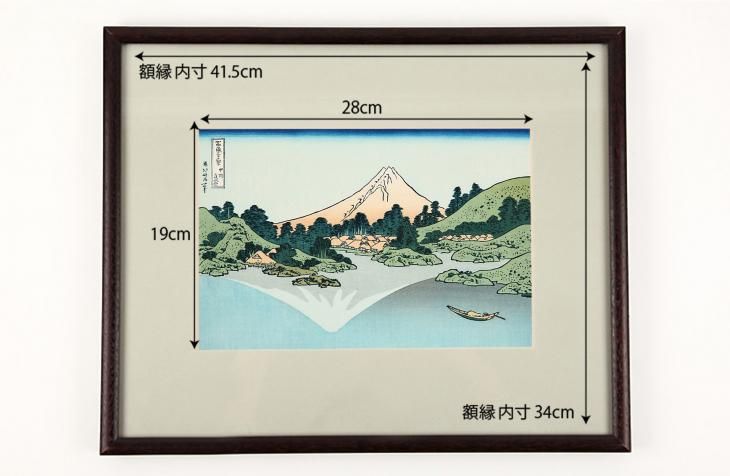 波ひとつない湖面に美しく映るさかさ富士は雪をまとっています。こんなところにも北斎の遊び心を感じます。