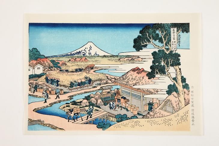 題名のとおり、全図に富士山のある風景を描いたシリーズ物で、葛飾北斎の代表作にとどまらず、浮世絵風景画の代表作ともいわれています。はじめ、三十六図が刊行されましたが、好評のため十図が追加され、計四十六図が刊行されました。当初の三十六図を「表富士」、追加の十図を「裏富士」と呼びます。富士山への篤い信仰は今と変わらず人々の間にあり、当時、集団で富士山に参拝する「富士講」が盛んに行われるなど、こうした社会背景のなかで北斎は『富嶽三十六景』を描き、爆発的ヒットとなりました。