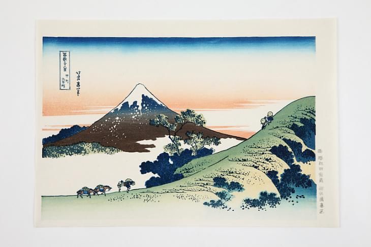 題名のとおり、全図に富士山のある風景を描いたシリーズ物で、葛飾北斎の代表作にとどまらず、浮世絵風景画の代表作ともいわれています。はじめ、三十六図が刊行されましたが、好評のため十図が追加され、計四十六図が刊行されました。当初の三十六図を「表富士」、追加の十図を「裏富士」と呼びます。富士山への篤い信仰は今と変わらず人々の間にあり、当時、集団で富士山に参拝する「富士講」が盛んに行われるなど、こうした社会背景のなかで北斎は『富嶽三十六景』を描き、爆発的ヒットとなりました。