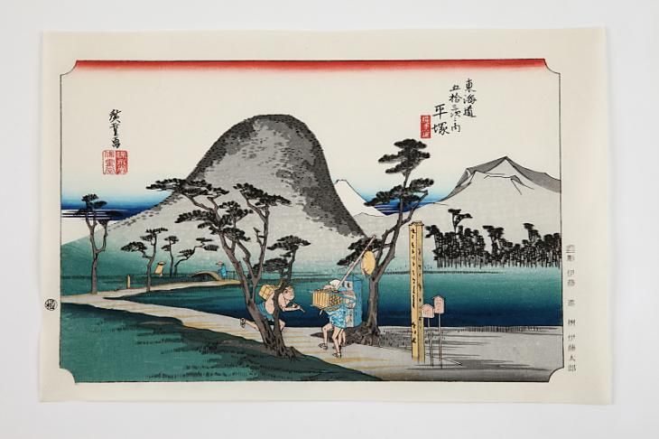 あぜ道に「平塚宿」と記された背の高い杭があり、ここから先にあることを示しています。正面の高麗山の向こうにのぞく白富士の姿、江戸へと急ぐ飛脚、カラ篭をかついで帰る篭かき二人、そして曲折した道の彼方に見える旅僧と百姓の姿。広重はいくつかの焦点をはっきり意識し、絶妙な遠近感を作り出しています。街道に沿って生えているバラバラ松の配慮も画調に合った巧みな表現です。