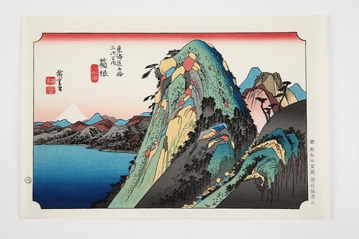 左手に深く沈んだ芦ノ湖の水面、遠山の上に富士の白雪。右手に駒ヶ岳、神山。箱根を登りきり、箱根町へ向かう急な斜面を下っている大名行列の姿だけが唯一の動きとなる素晴らしい構図です。中央にそそり立つ駒ヶ岳らしい山肌に数多くの色をモザイク状に使い分けた独特の配色は、仏蘭西の印象派に影響を与えたといわれています。こうした色の使い分けは、広重の絵のなかでも特異なものでした。