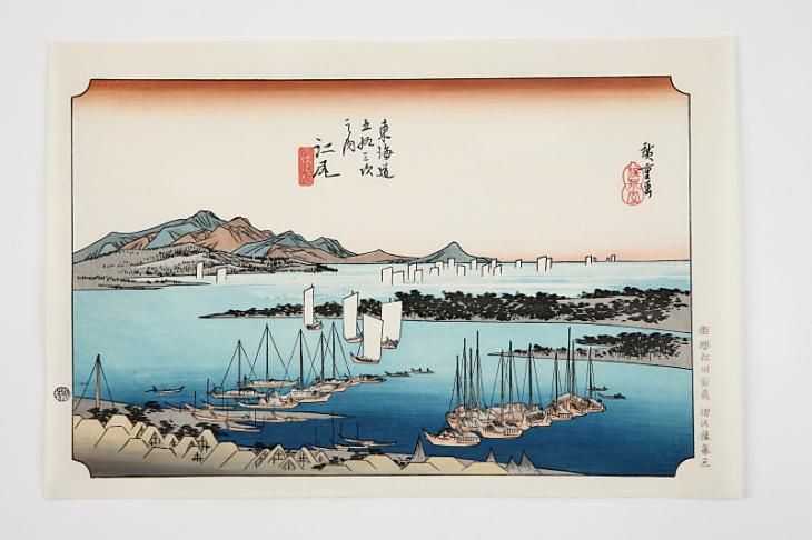 画面はほとんどが海で占められていますが、近景は港の風情、中景は入江に突き出る三保の松原や湾内の帆船で風情をもたせ、遠景は愛鷹山らしい山並みの遠望から霞を隔てた海上に数多くの帆影で賑やかさを見せています。この絵は完全な風景画ですが、広重独特の色彩と構図の処理により、この風景画を自分のものとしています。