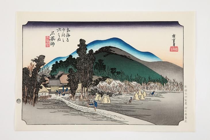 林のなかに描かれた寺は西福寺といいますが、ここにある石薬師仏が有名なため、画題は「石薬師寺」とつけられました。西福寺に連なる寒村が山懐に抱かれ、全体の構図が実にいい味を出し、裏山が三段にぼかされているのも効果的です。寺の門前の馬上の旅人、縄手道を歩む二人の百姓、田を耕す百姓などの添景人物が冬の村景として興趣つきないものとなっています。