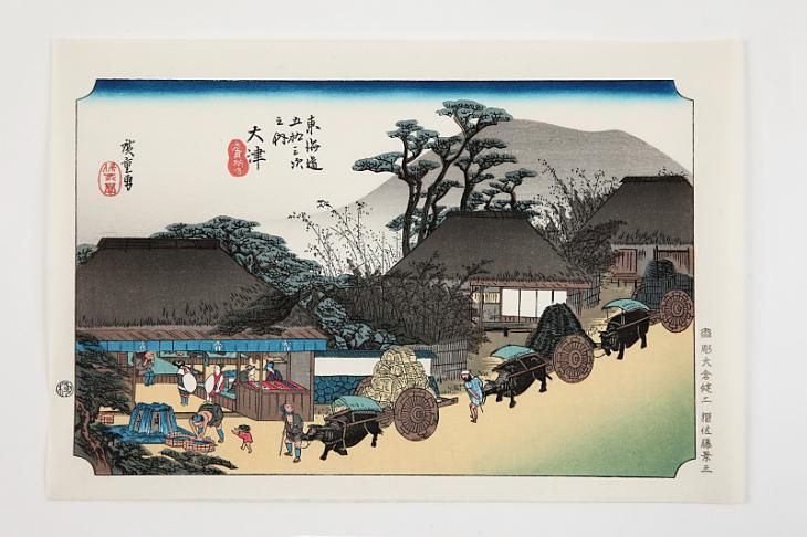 大津は東海道最大の宿で、天智天皇大津の宮のあとでもあり、附近には近江八景や名所旧蹟に富み、大津絵、源五郎鮒などの名物も多くありました。しかし広重は画題を「走井(はしりい)茶屋」とし、「走井餅」を売っていた茶屋を題材に選びました。こんこんと清水が湧き出る走井の有名な井戸も描かれています。茶店の前の街道を米俵や炭俵を乗せた牛車が連なっていき、いかにも京都の近さを思わせています。