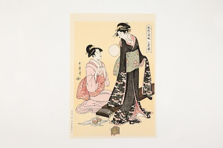 3作とも女性ふたりの夏姿を描き、部屋のなかの様子や小物の描写で品位を表現しています。この絵は、みるからに深窓の娘の上品さを表し、口に袖をあてて話をする仕草や、足元には季節を先取りする虫かごを置いて生活の上級感を表しています。美しい黒の大振袖を着て立つ娘を引き立たせるため、地味な着物を着た人物を並行に配したり、背景を黄潰しにしているところも手法として考えられます。
