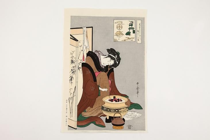 これは、おきたが朝顔というあだ名の男性に好意をもたれ迫られたのに、おきたはそれに応じなかったと解釈できます。恋文らしきものをそばに置き、火箸で火をなおしながら物思いに沈んでいるように見えるおきたの姿は、朝顔との仲を悩むものかもしれません。後ろの屏風に手ぬぐいの端を結ぶ紅絹や打掛の裏地の緑、炭火の赤などが画面にアクセントを与えています。