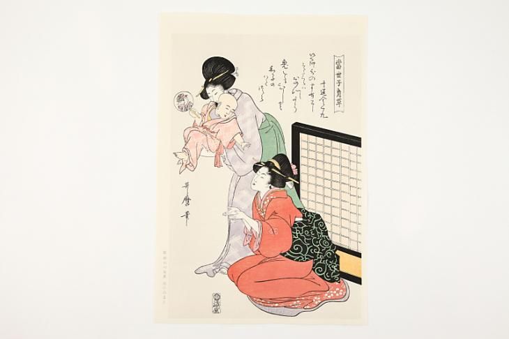 これは文化元年頃の作品で、この頃になると子どもをテーマにした作品が多くなってきています。この年、太閤記を題材にした作品によって入牢および手鎖五十日の刑を受け、心身ともに疲れをみせる歌麿ですが、衝立てと二人の女性と子どもをひとつの画面に巧みに描き込み、安定した構図を示しています。