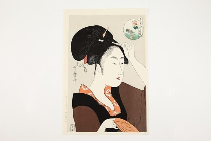 狩野派の町絵師・鳥山石燕に絵を学んだのち、版元・蔦屋重三郎に才能を見出され、精力的に錦絵や狂歌絵本などを手がけるようになりました。1791年頃から美人画に大首絵を取り入れ、さらに評判の茶屋娘らをモデルとした作品で人気を博し、浮世絵美人画の第一人者への道をのぼりつめていきます。評判の美人をひと目見ようと、彼女たちの働く店に多くの人が集まるほど、歌麿の描く美人画は世の中に影響を与えていました。その後、寛政の改革の一環により多くの表現の制約が課せられましたが、屈することのない歌麿は浮世絵の黄金期を支える存在となりました。1804年、当時禁止されていた豊臣秀吉の絵画化で罰せられ、その二年後に没しました。